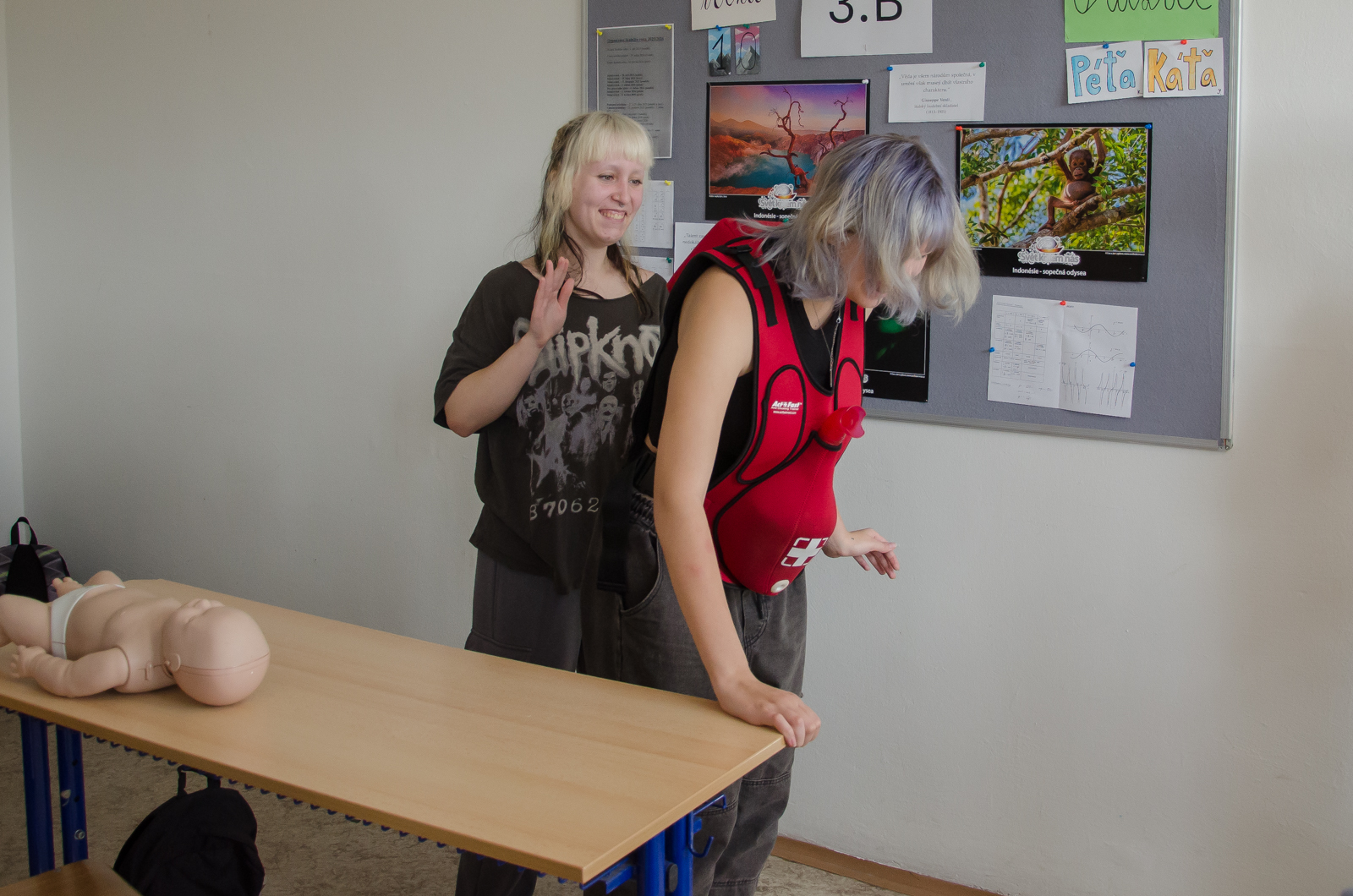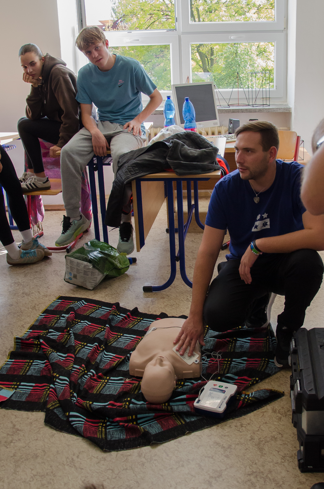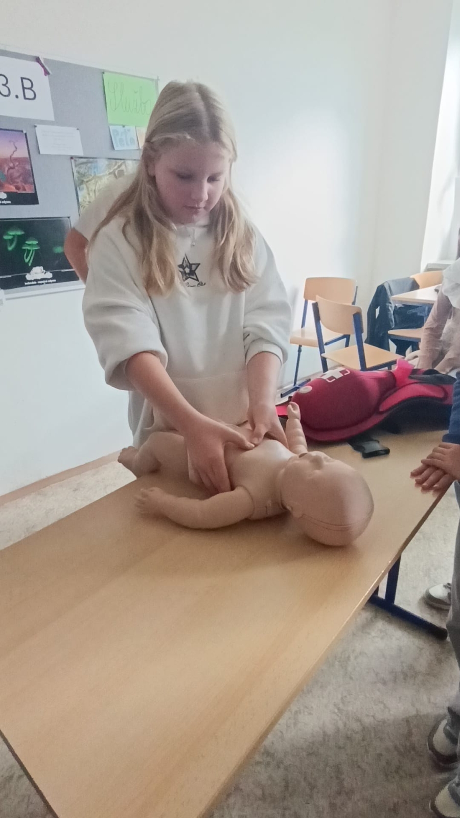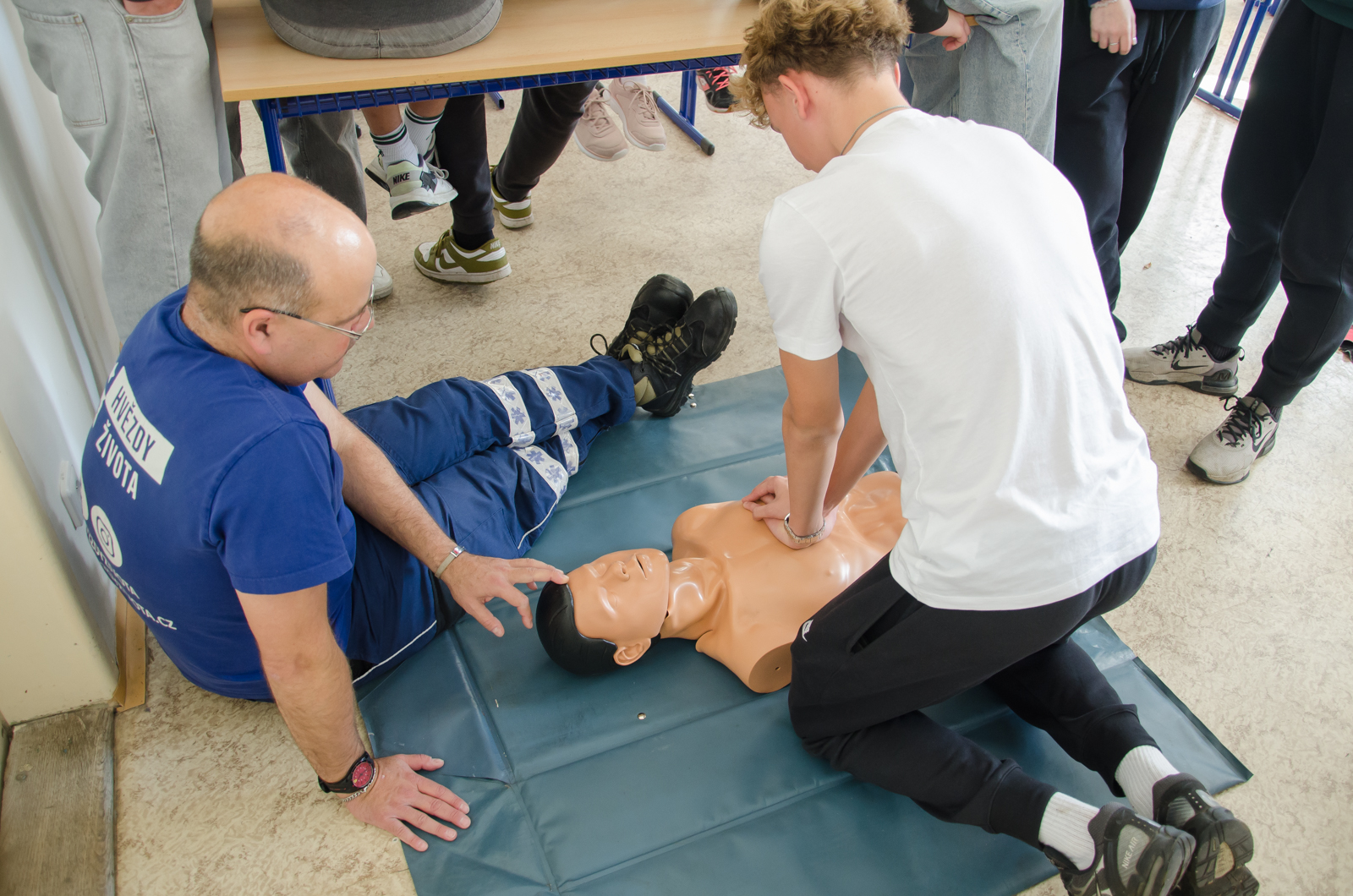 V rámci přednášky Hvězdy života se studenti věnovali první pomoci. Naučili se, jak reagovat v situaci, kdy člověk leží bez známek pohybu, a prakticky si vyzkoušeli resuscitaci na figurínách – jak dospělých, tak dětských. Nechyběla ani simulace zásahu při dušení, včetně úderů do zad a Heimlichova manévru.