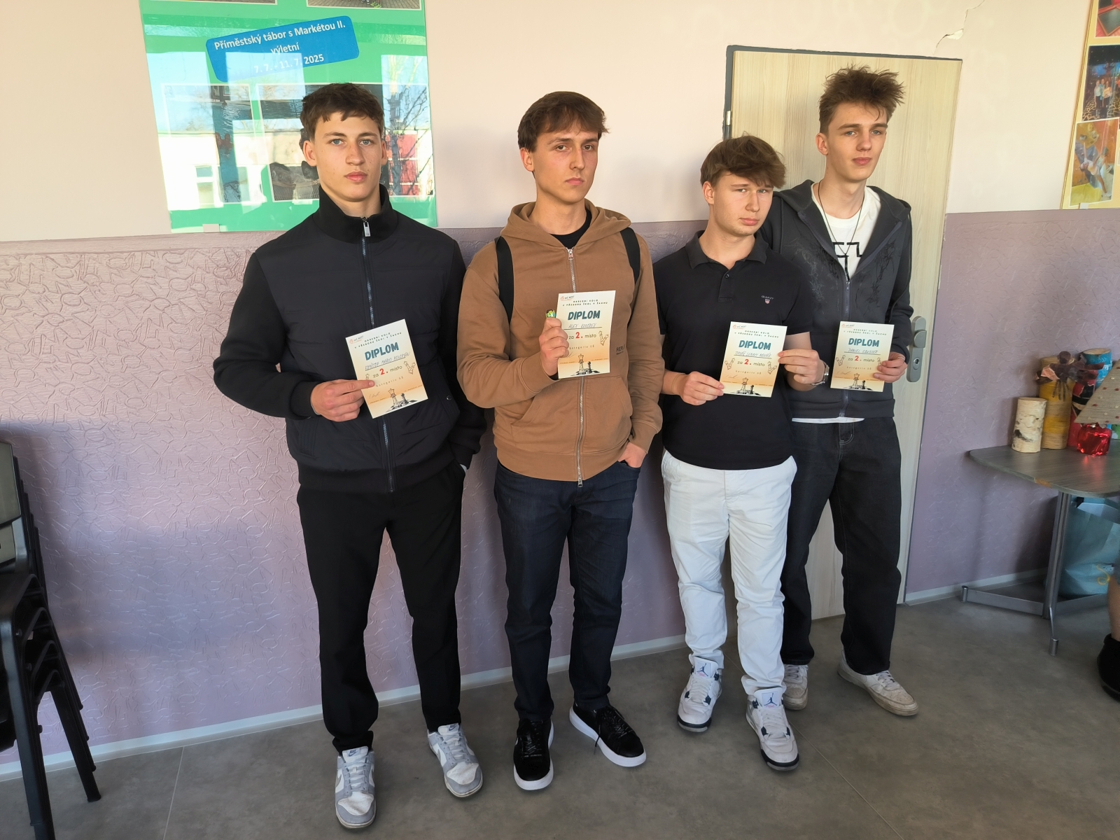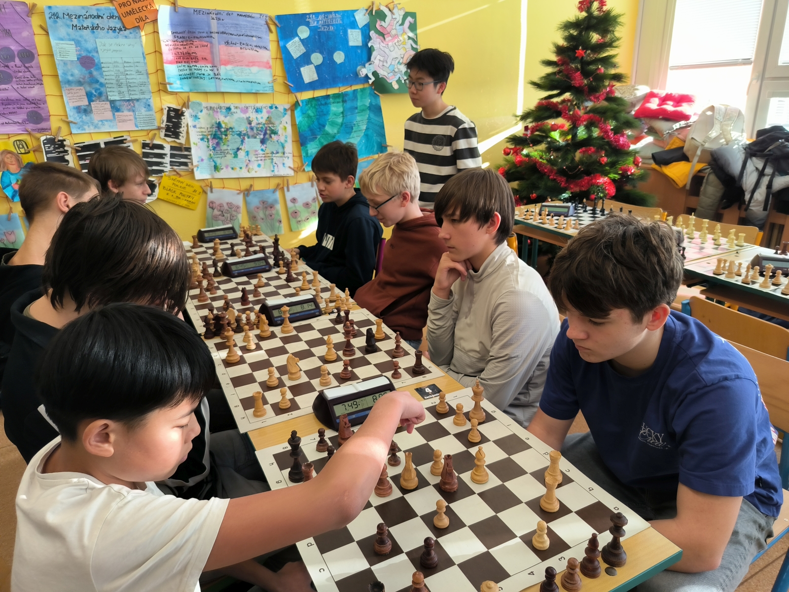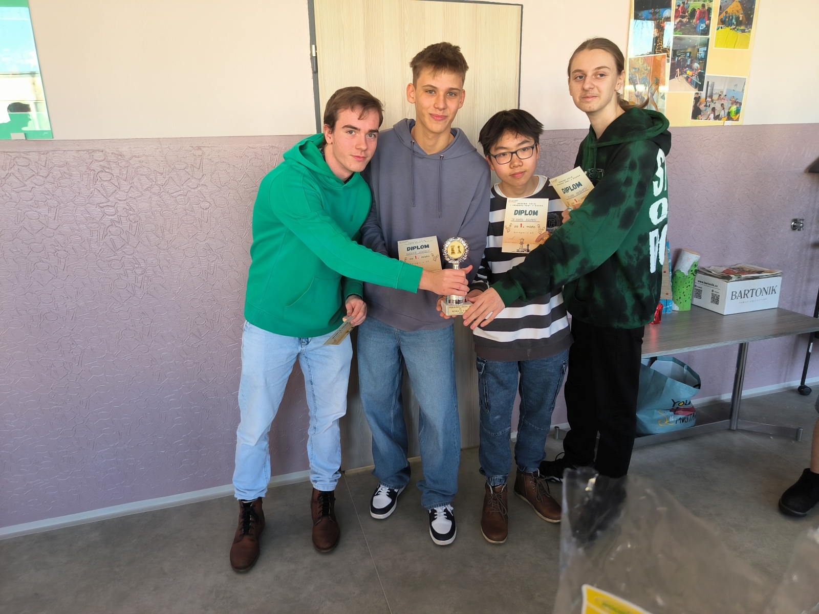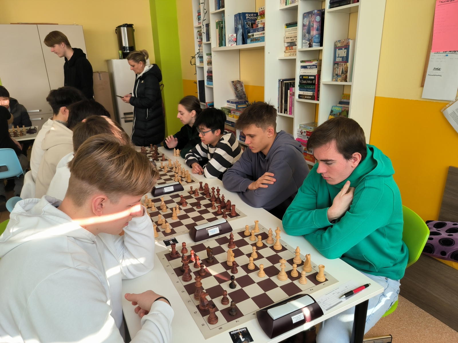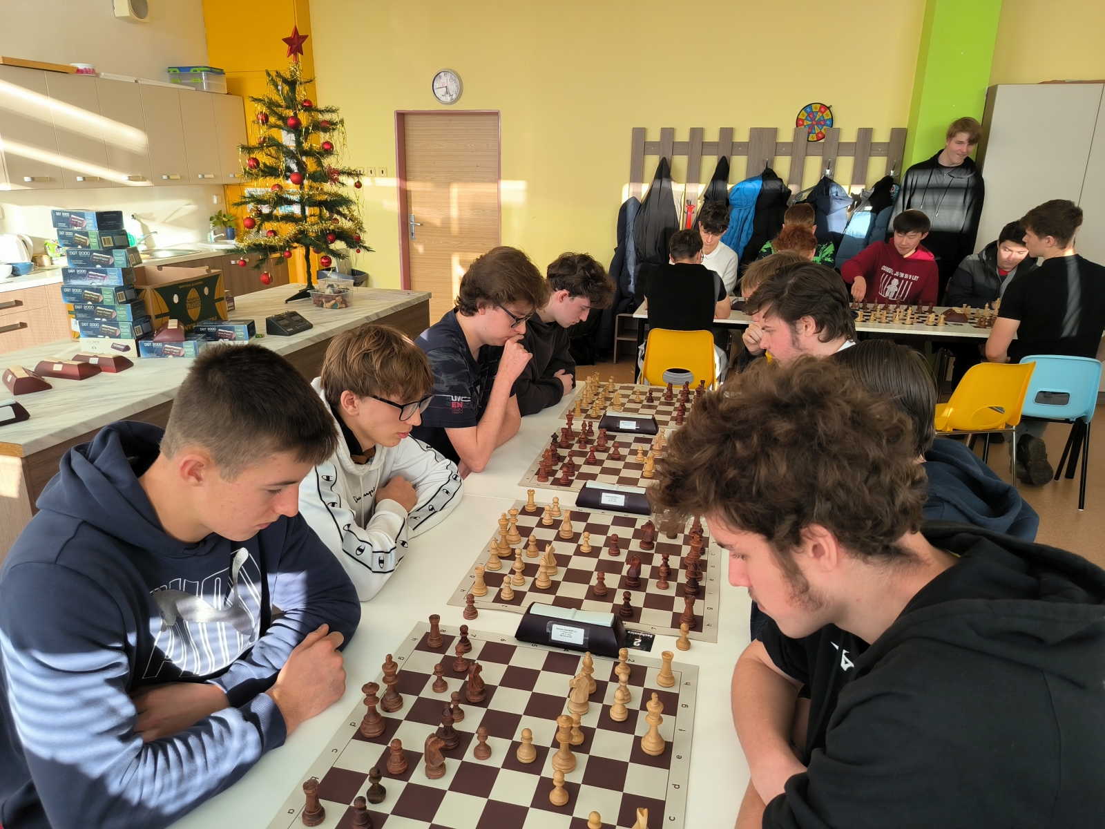 V pátek 12. prosince 2025 se konalo okresní kolo turnaje školních družstev v šachu. Škola vyslala celkem čtyři družstva. Tři soutěžila v kategorii středních škol a jedno, složené z žáků tercie, v kategorii základních škol 2. stupeň. Dvě naše družstva skončila na prvním a druhém místě a vybojovala tak v kategorii SŠ postup do krajského kola. To se bude konat v úterý 27. ledna 2026 v Lounech.