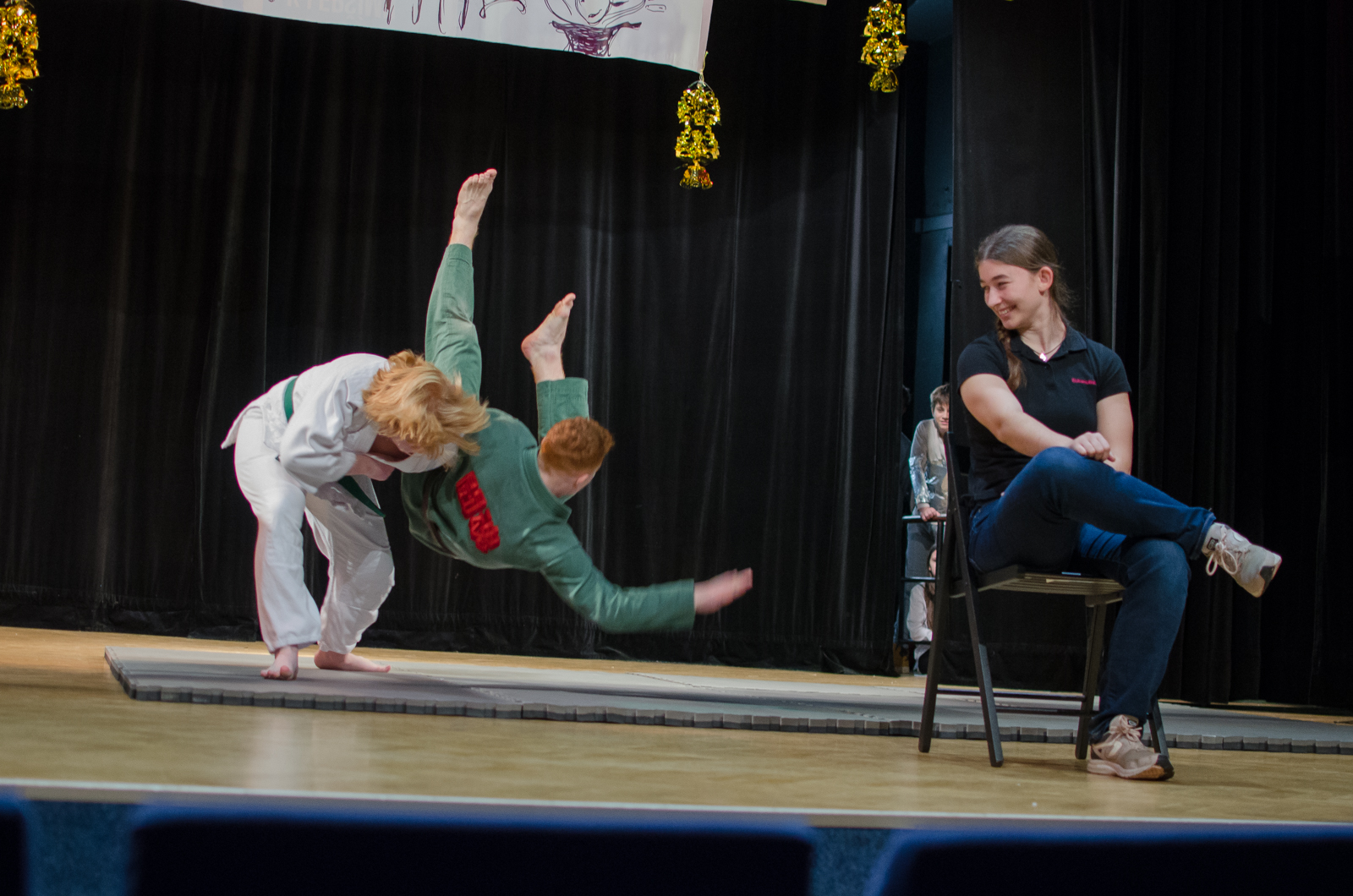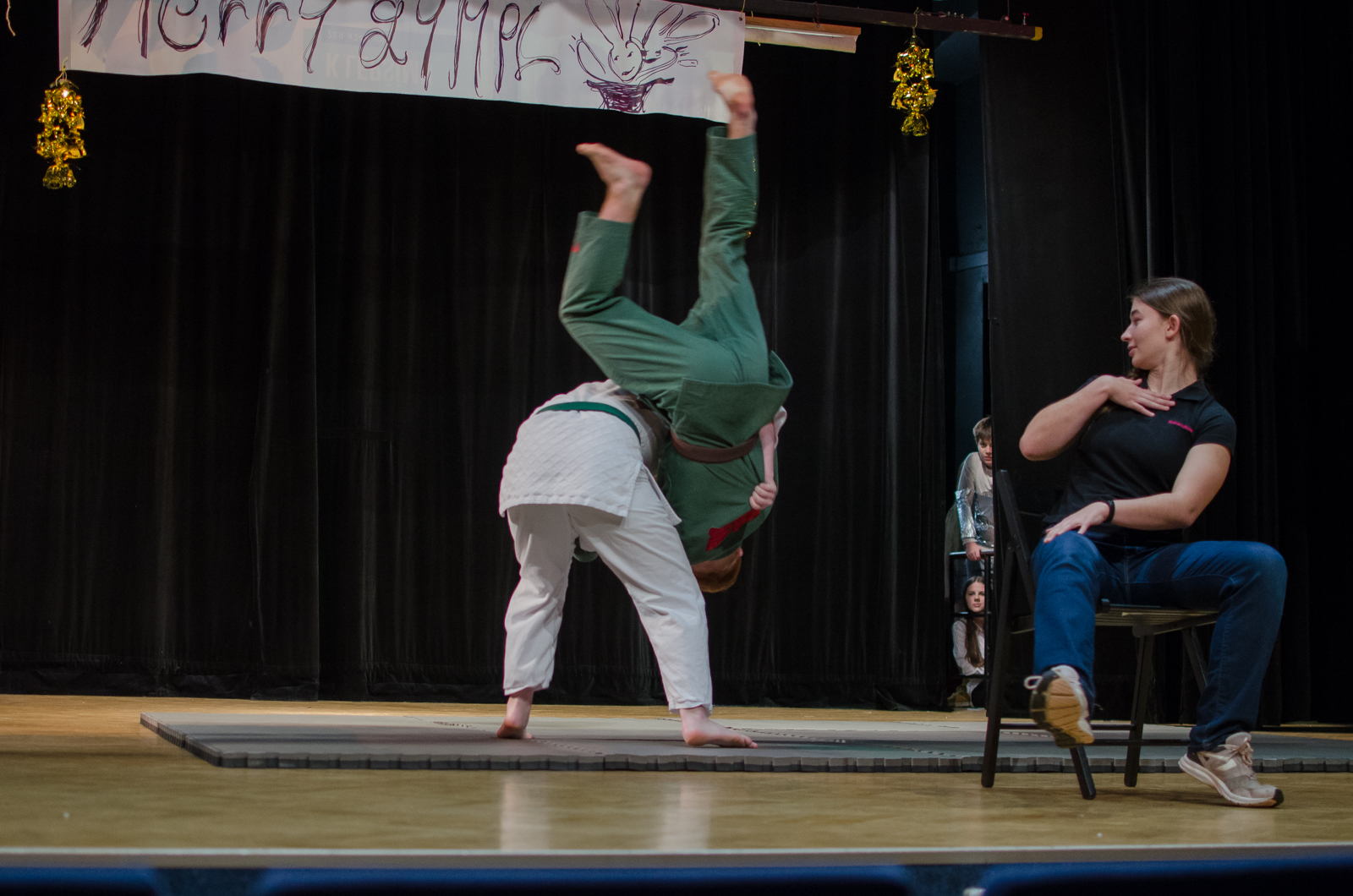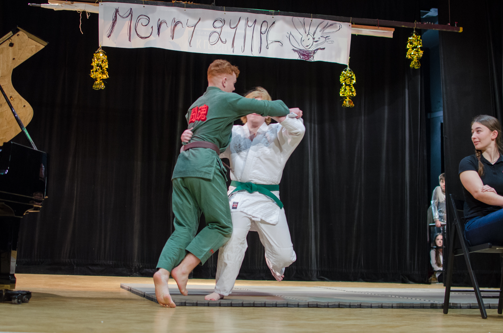 Žáci školy si mohli vyslechnout sólovou hru na klavír v podání těchto interpretů: Vojtěcha Dvořáka (O3), Tomáše Gáby (1.A), Anujin Gombodori (1.B) a Tadeáše Krále (3.C). Písně zazpívaly Solomia Bobko (O2), Barbora Kurachová (3.A), Kristýna Loukotová (1.B) a Aneta Pašková (4.B) spolu s Karolínou Gremlicovou (O8). Na akordeon se představil Lukáš Bubeník (O2) a na elektrickou kytaru skvělý Jiří Laštovka (O1). Taneční scénu reprezentovala Amálie Raková spolu s tanečním souborem ZUŠ Most. Ukázky juda a jiu jitsu předvedli Hynek Pomahač (O8) ve spolupráci s Vítem Pomahačem a Janem Fajfrtem. Vlastní tvorbu představila i paní učitelka Mgr. Ivana Hotová. Divadelní představení nám předvedli žáci tercie a oktávy. Celým programem provázela moderátorská dvojice Klára Uškovičová a Tomáš Balín z oktávy. Doufáme, že se jednotlivá vystoupení žákům i učitelům líbila. Tímto bychom chtěli též všem účastníkům akademie poděkovat a všem žákům a učitelům popřát krásné a veselé vánoční svátky.