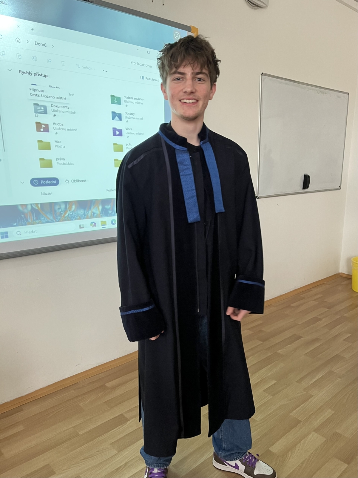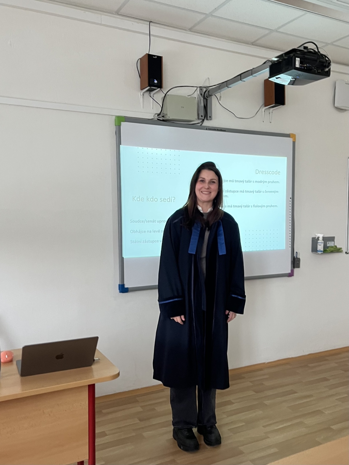 Paní advokátka nám přinesla na ukázku i advokátní talár, který je povinným „dress codem“ při jednání u soudu. V závěru přednášky jsme si ho mohli sami vyzkoušet, takže jsme si alespoň na chvíli mohli připadat jako skuteční advokáti v soudní síni. Tento praktický závěr byl pro mnohé z nás příjemným a zábavným zpestřením celé besedy.