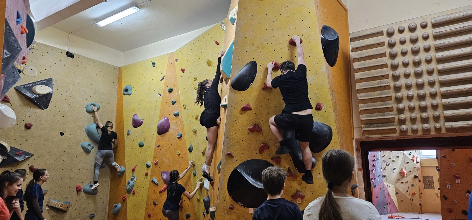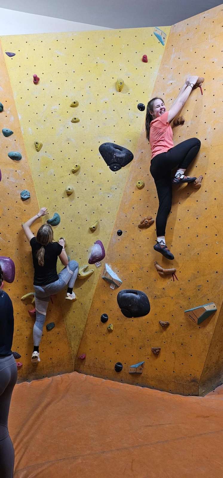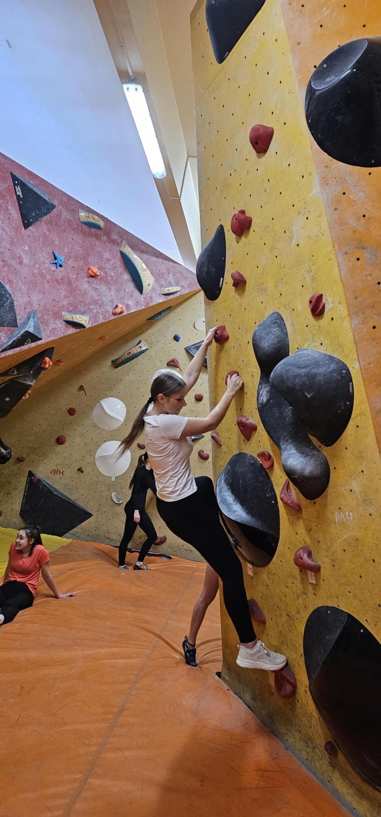 Začali jsme návštěvou boulderovky, kde jsme půl hodiny bez jištění bojovali s gravitací v převisech a vyzkoušeli si trasy různých obtížností- od těch dětských po ty pro profíky!