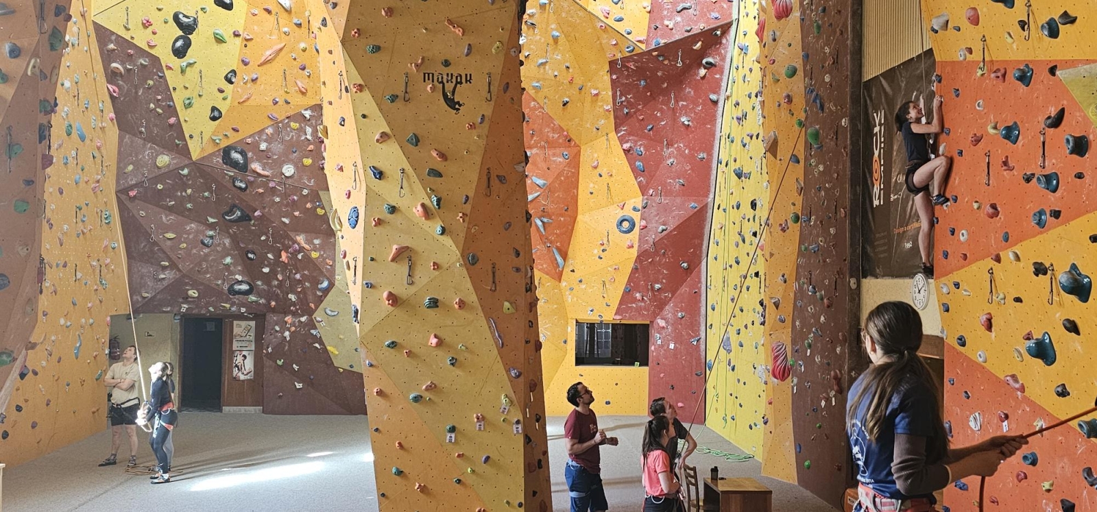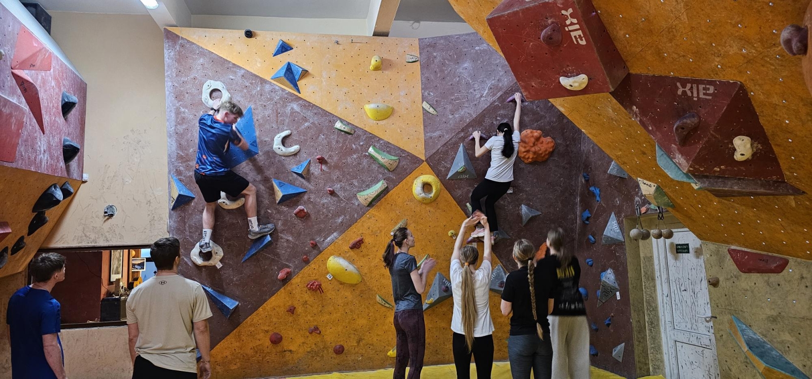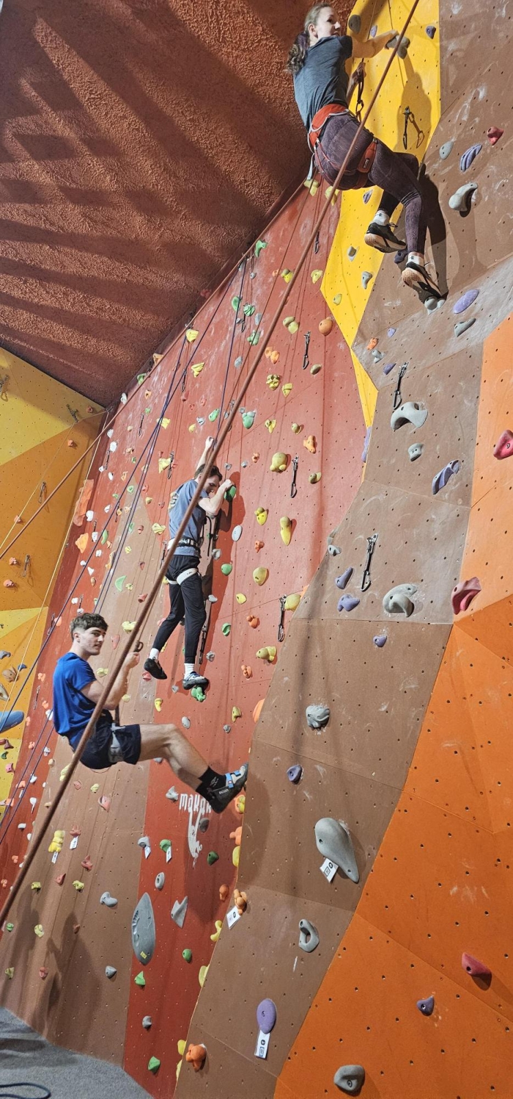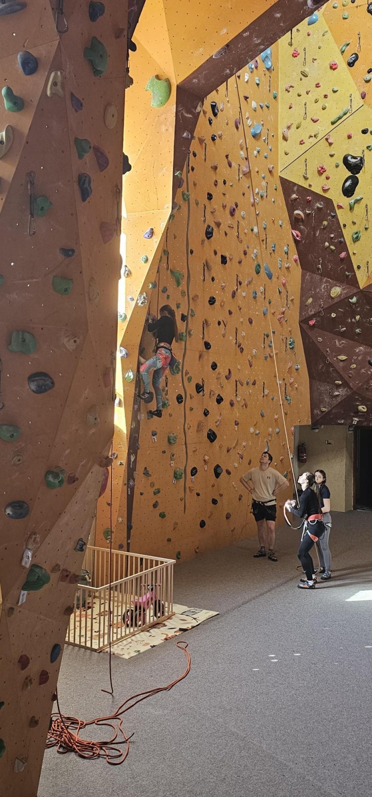 Začali jsme návštěvou boulderovky, kde jsme půl hodiny bez jištění bojovali s gravitací v převisech a vyzkoušeli si trasy různých obtížností- od těch dětských po ty pro profíky!