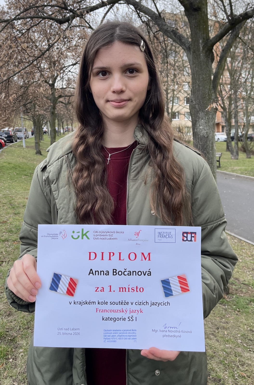 Ve středu 25. března se odehrálo v Ústí nad Labem jako každoročně krajské kolo Olympiády ve francouzském jazyce. Naši školu reprezentovala žákyně kvinty, Anička Bočanová. V náročném klání se jí velmi dařilo a vyhrála pro naši školu krásné 1. místo, ke kterému jí gratulujeme!
