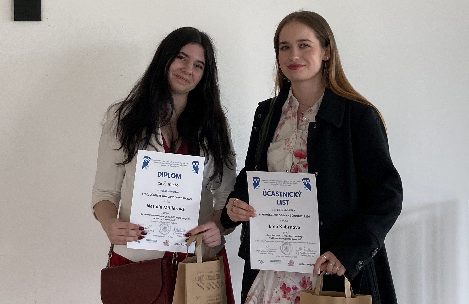 Natálie dosáhla výborného výsledku v oboru molekulární biologie a obsadila krásné 2. místo. Ema představila svou práci z oblasti psychologie. Obě studentky prokázaly velký zájem o obor, pečlivý přístup ke zvolenému tématu a schopnost samostatného uvažování.