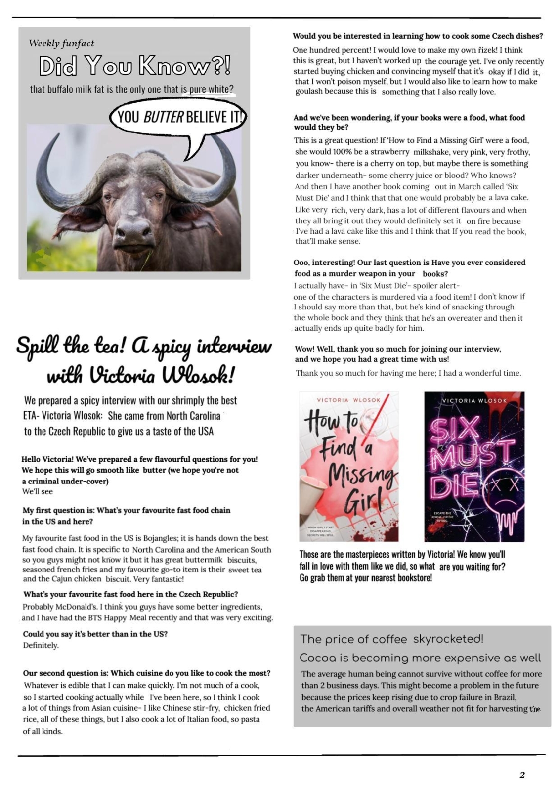 Tento projekt byl nejen skvělou příležitostí k procvičení jazyka, ale také k rozvoji kreativity a týmové spolupráce. Děkujeme Victorii za její čas, energii a ochotu podělit se s námi o své zkušenosti.