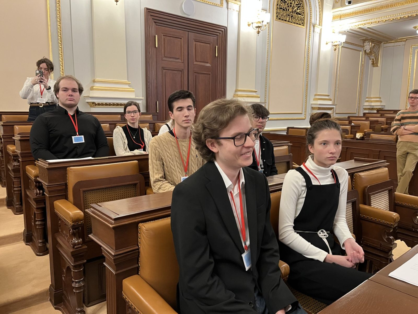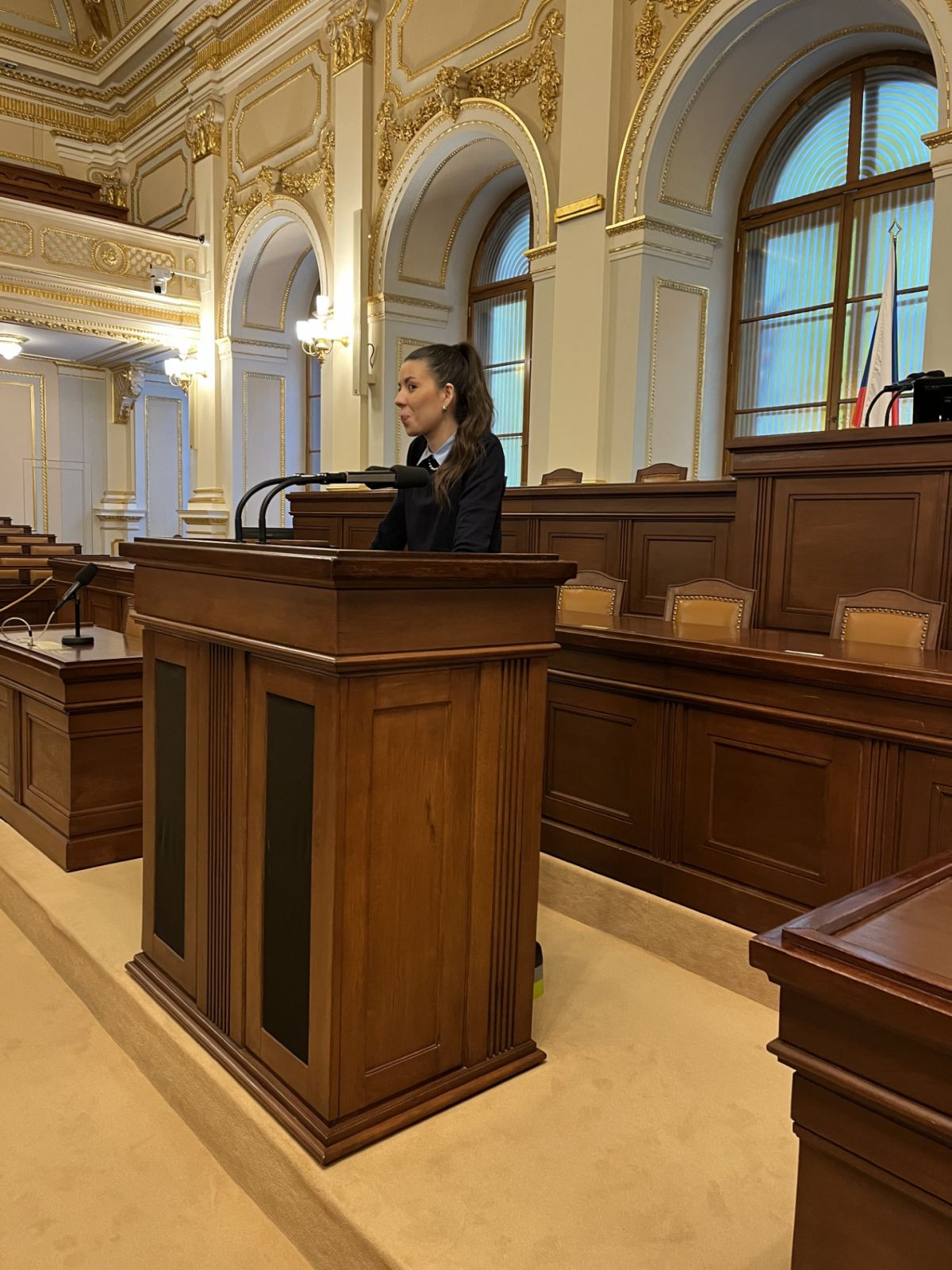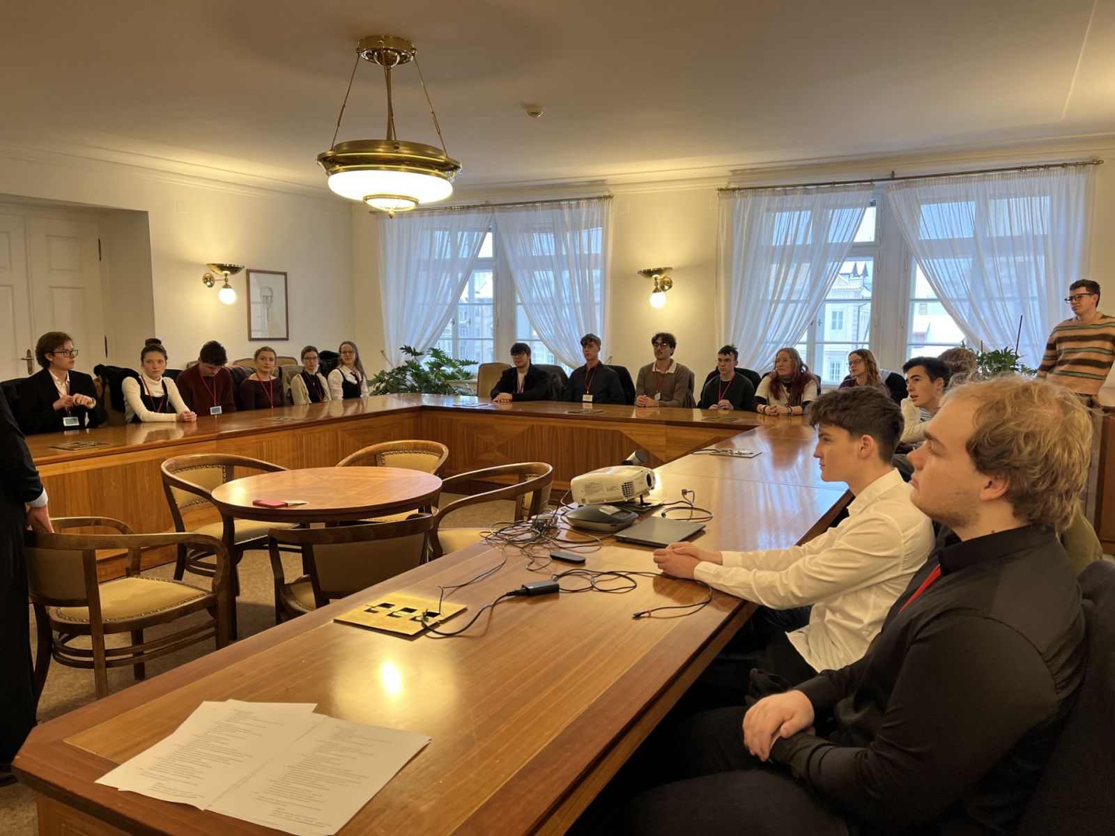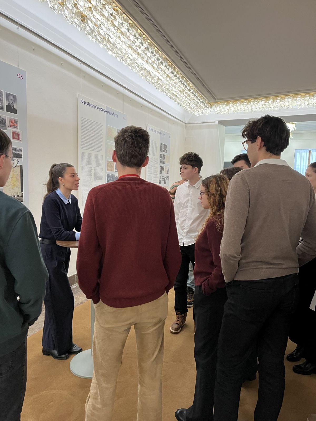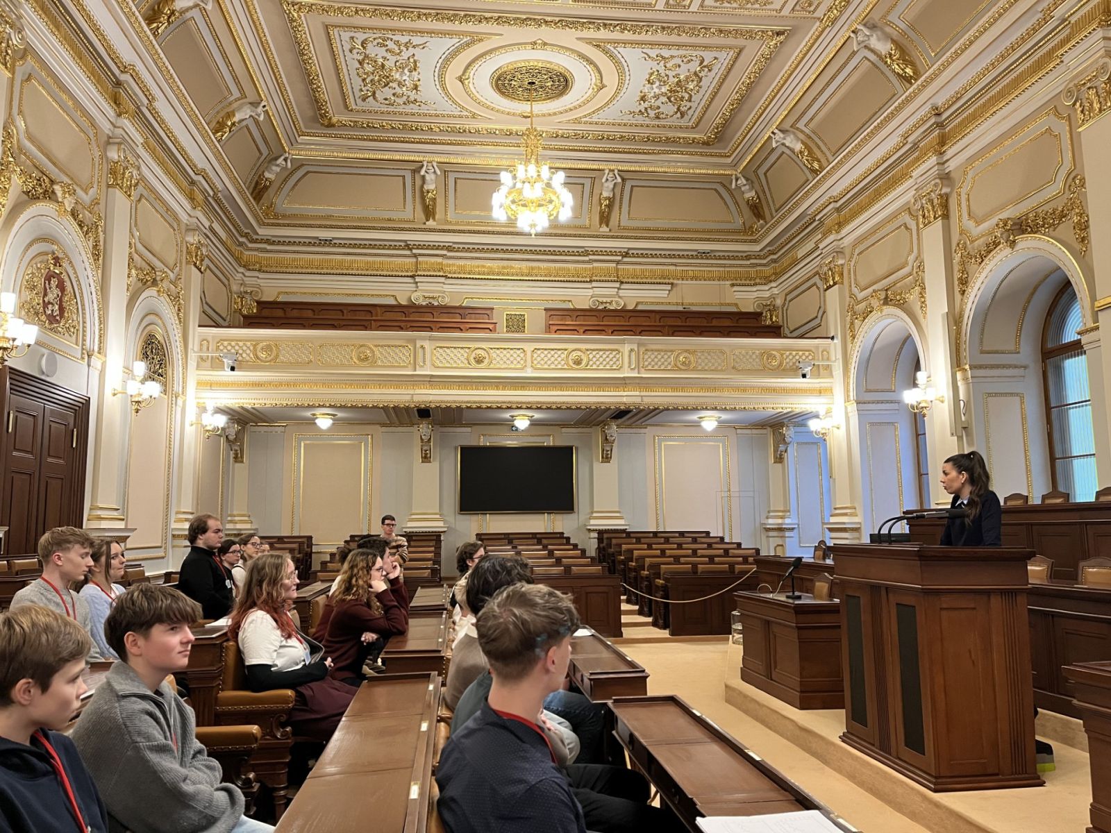 Naší průvodkyní byla nově zvolená poslankyně Kateřina Stojanová, která je původem z Litoměřic a byla i zastupitelkou za Ústecký kraj. Prošla s námi veškeré možné prostory a chodbičky této legislativní budovy a díky tomu jsme se podívali do prostorů pro média, do kanceláří některých politických stran či na výstavu ústavních dokumentů důležitých pro Českou republiku. Ale zlatým hřebem byl samozřejmě samotný jednací sál, kde si mohli studenti sednout na místo politiků či k řečnickému pultíku. Paní poslankyně nás zásobovala zajímavými fakty z půdy Poslanecké sněmovny a ukázala i pověstné toalety, na kterých se údajně našla zbraň. Velký zážitek jsme si potom odnášeli, když nás v jedné chodbě překvapil samotný pan předseda Sněmovny Tomio Okamura.