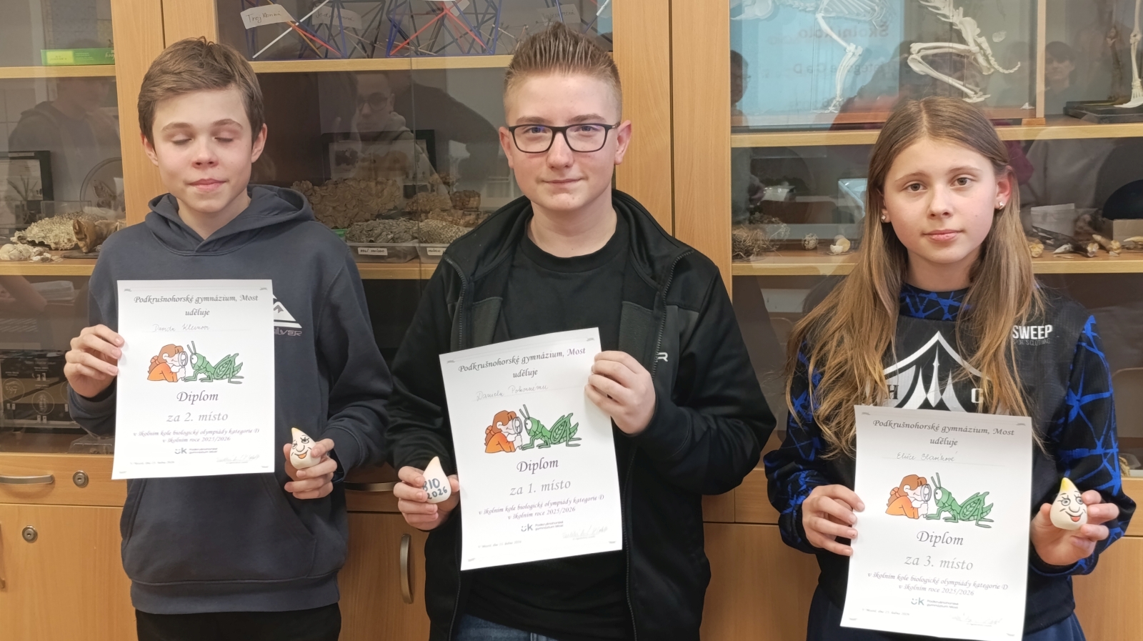 Jako každý rok, tak i letos proběhla na naší škole biologická olympiáda. Tajemný život lesů zkoumalo 24 žáků z primy až kvarty. Na stupních vítězů v kategorii C (tercie a kvarta) stanuli Adéla Těšitelová, Jan Vítek a Kristýna Vránová, v kategorii D (prima a sekunda) pak Daniel Pokorný, David Klein a Eliška Slavíková.